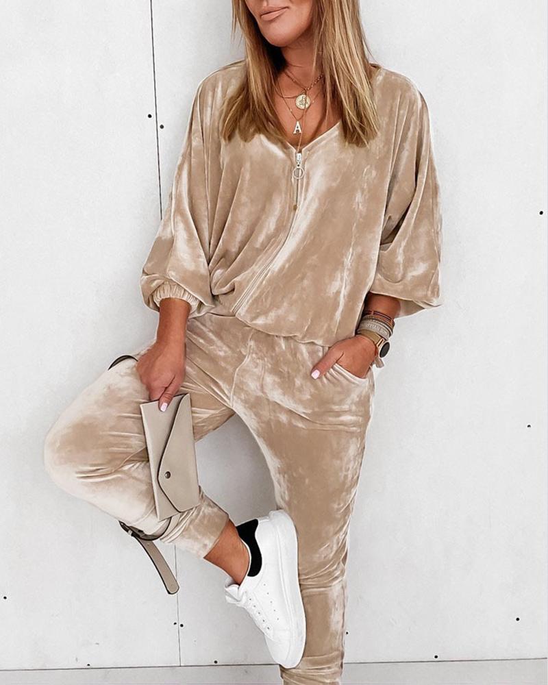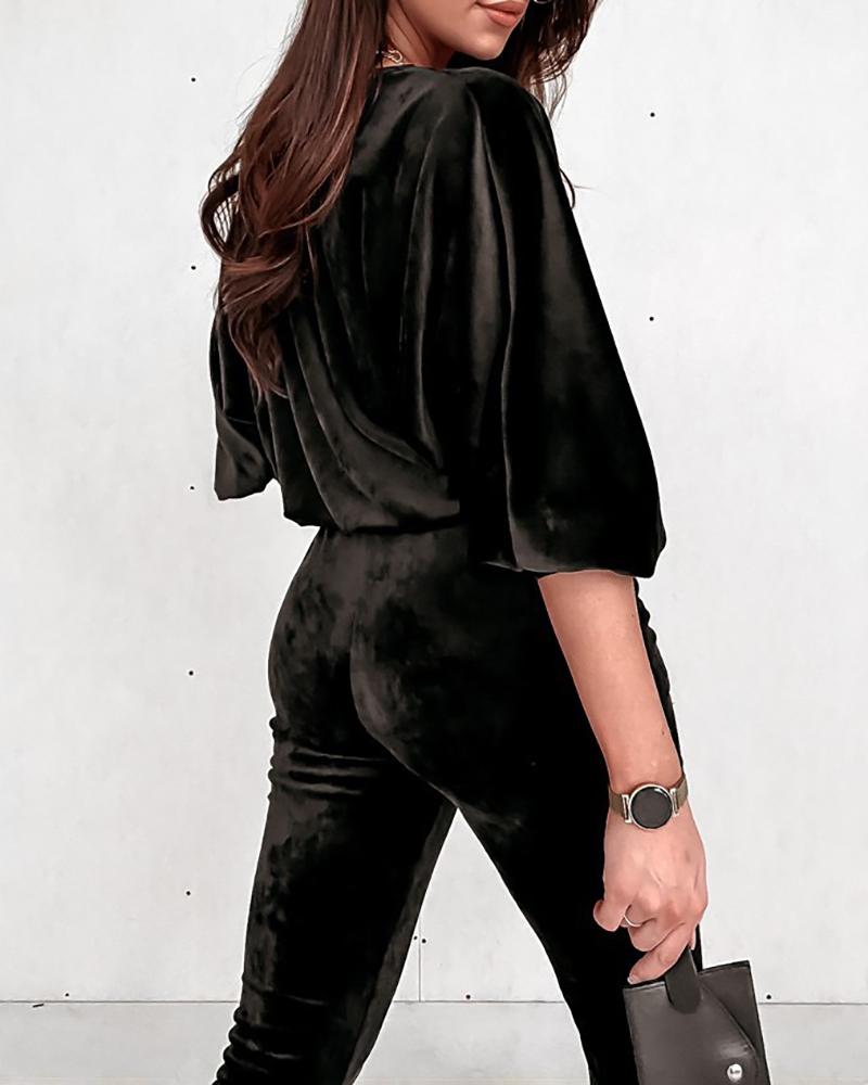 Velvet Lantern Sleeve Top & Pocket Design Pants Set