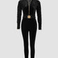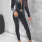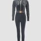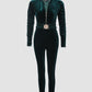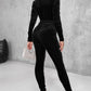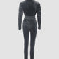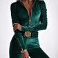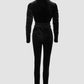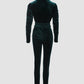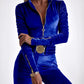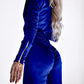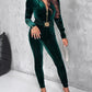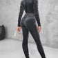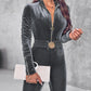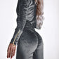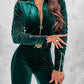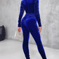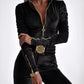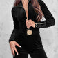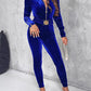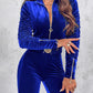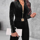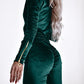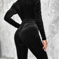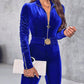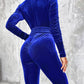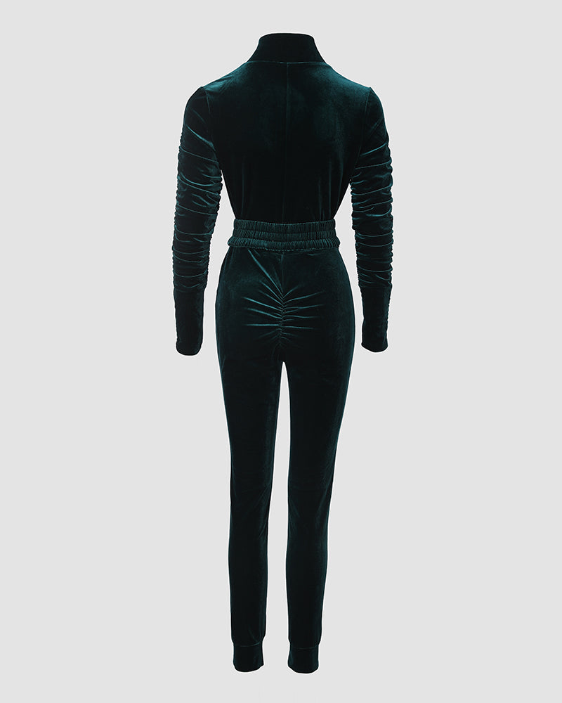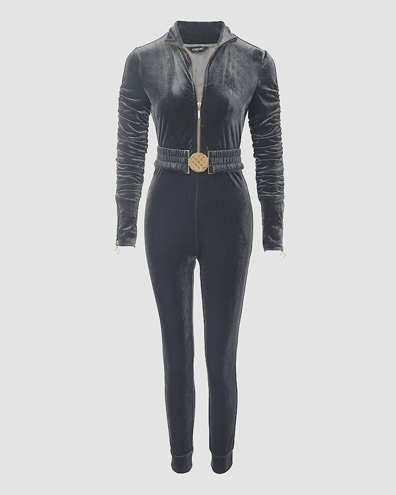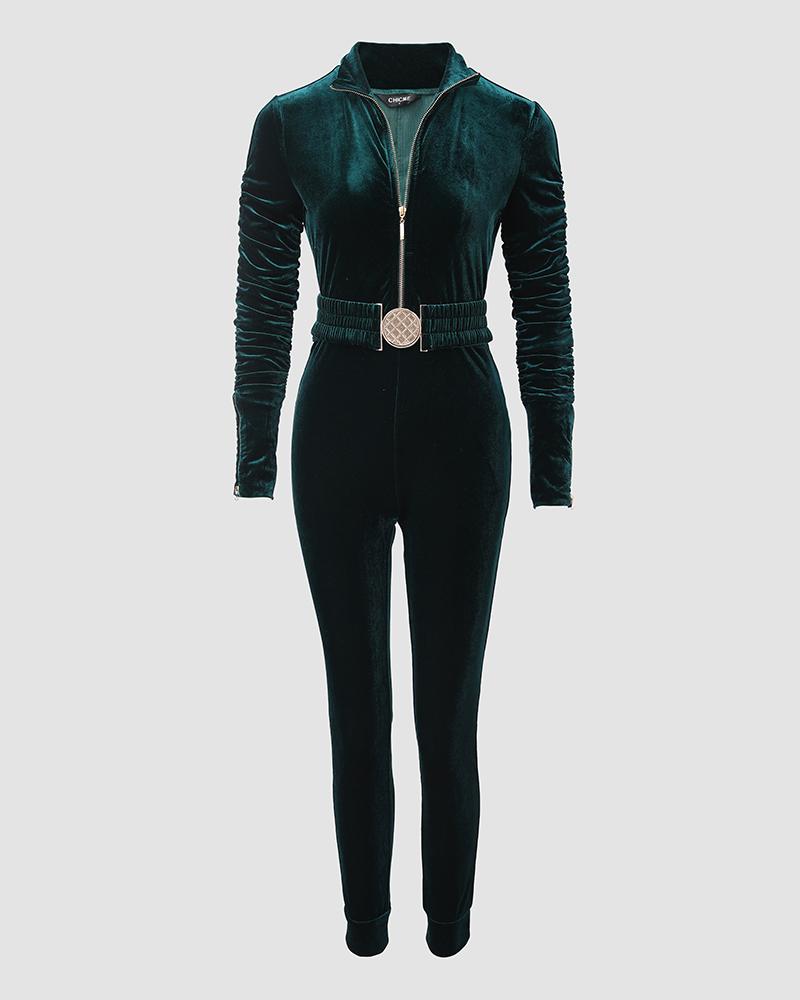 Velvet Zipper Design Ruched Long Sleeve Jumpsuit With Elastic Waistbelt