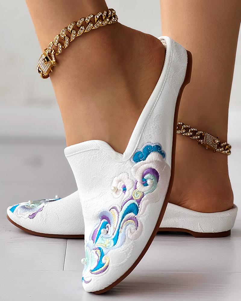 Vintage Cloud Embroidery Pearls Slip On Mules