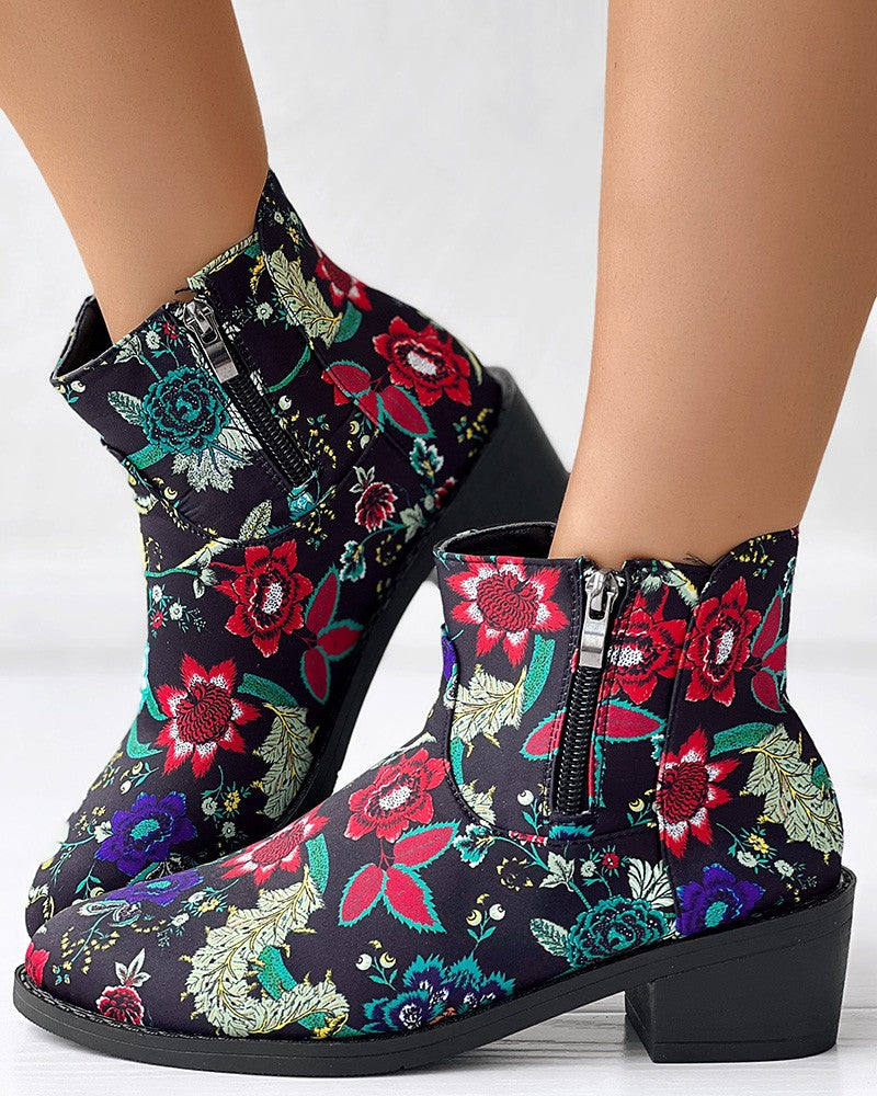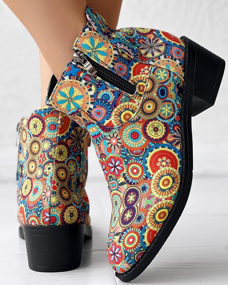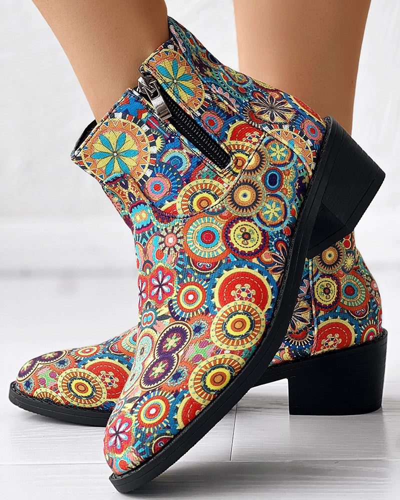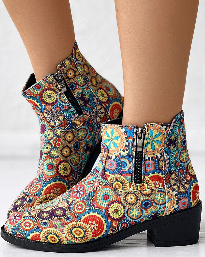 Vintage Floral Tribal Pattern Zipper Back Ankle Boots