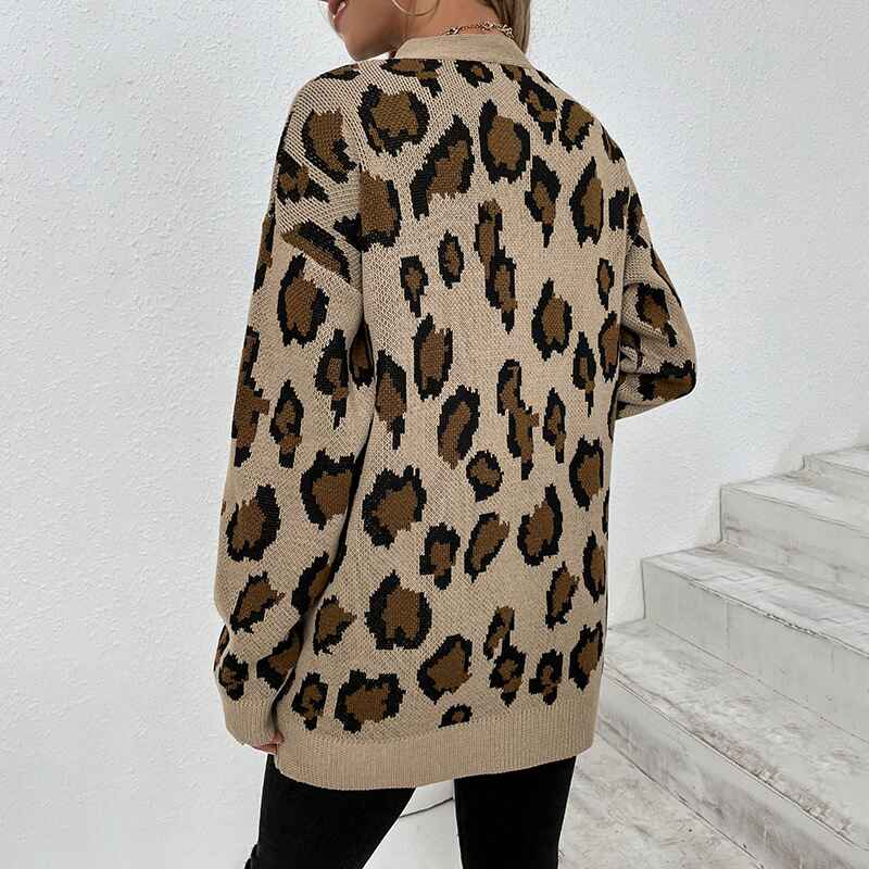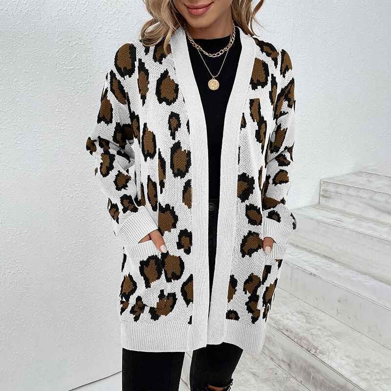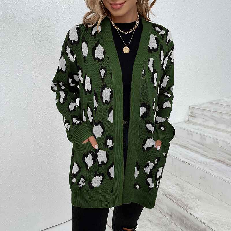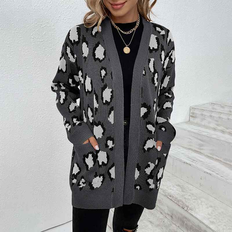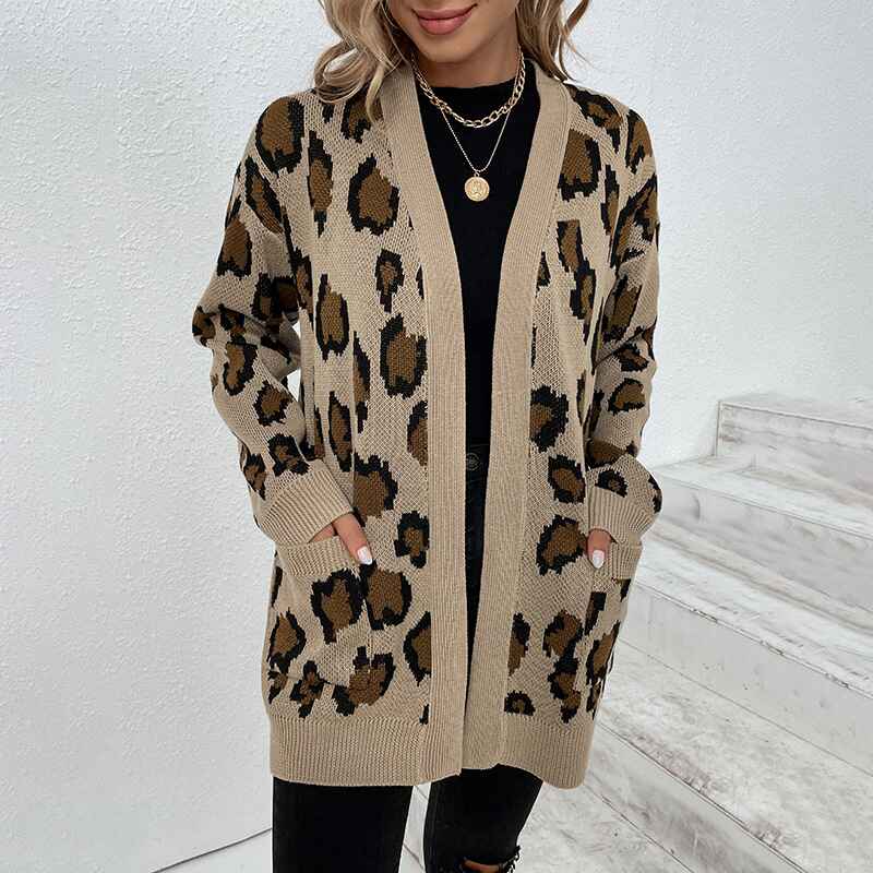 Women's Open Front Leopard Knit Cardigan Sweaters Pockets Long Sleeve Outwear K272