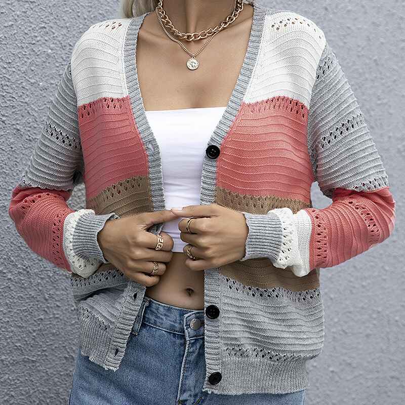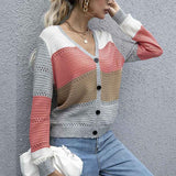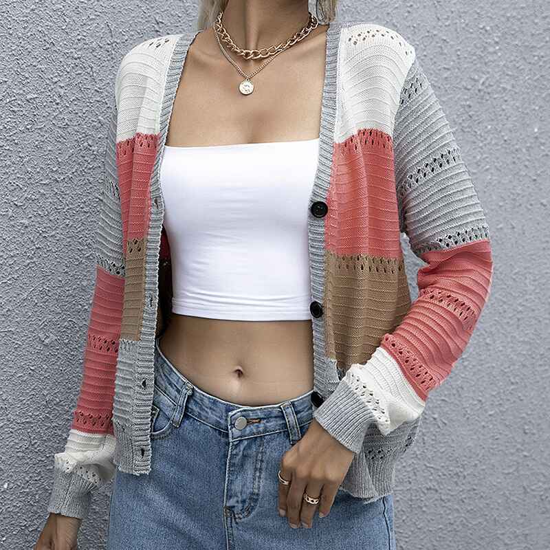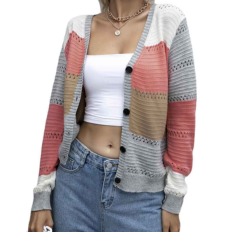 Women Striped Cardigan Sweater Open Front Button Down Cardigan Coat Outwear with Pockets K370