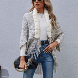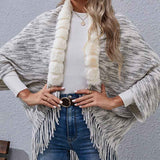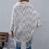 Women's Elegant Knitted Shawl Poncho with Fringed V-Neck Striped Sweater Pullover Cape K379