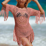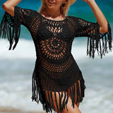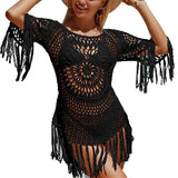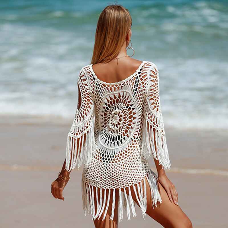 Women's Cover Up White Crochet Hollow Out Tassel Swimsuit Three Quarter Sleeve K568