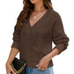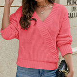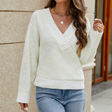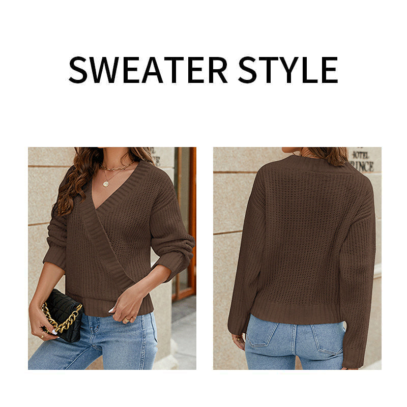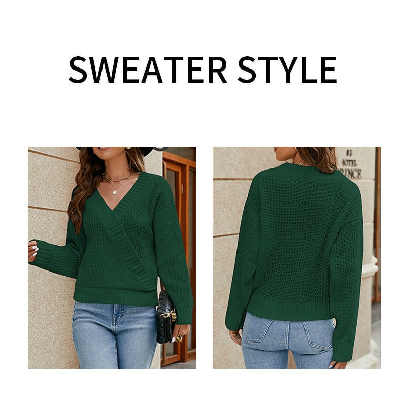 Women Deep V Neck Wrap Sweaters Long Sleeve Crochet Knit Pullover Tops K587