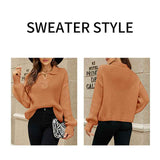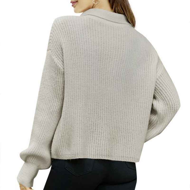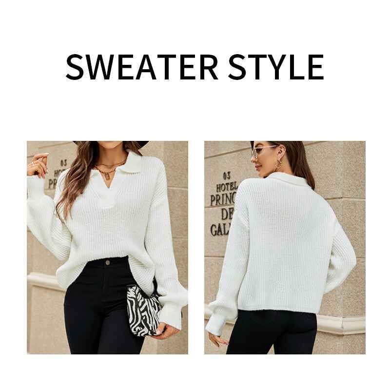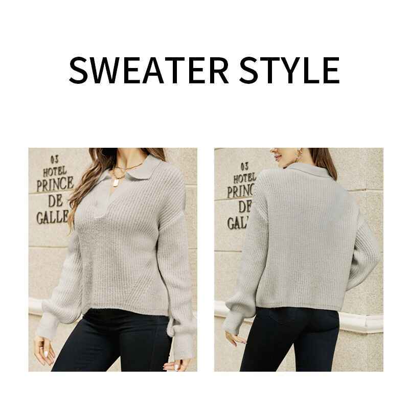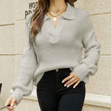 Women's Fall Lapel Collar V Neck Long Sleeve Ribbed Knit Comfy Pullover Sweater Jumper Top K595