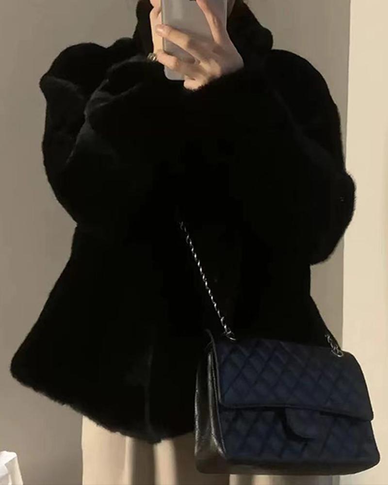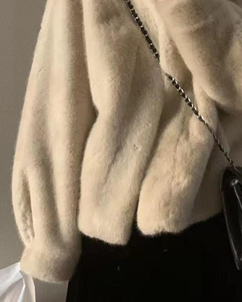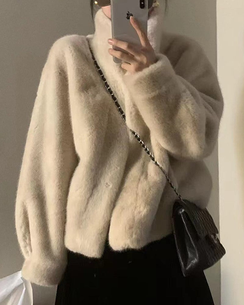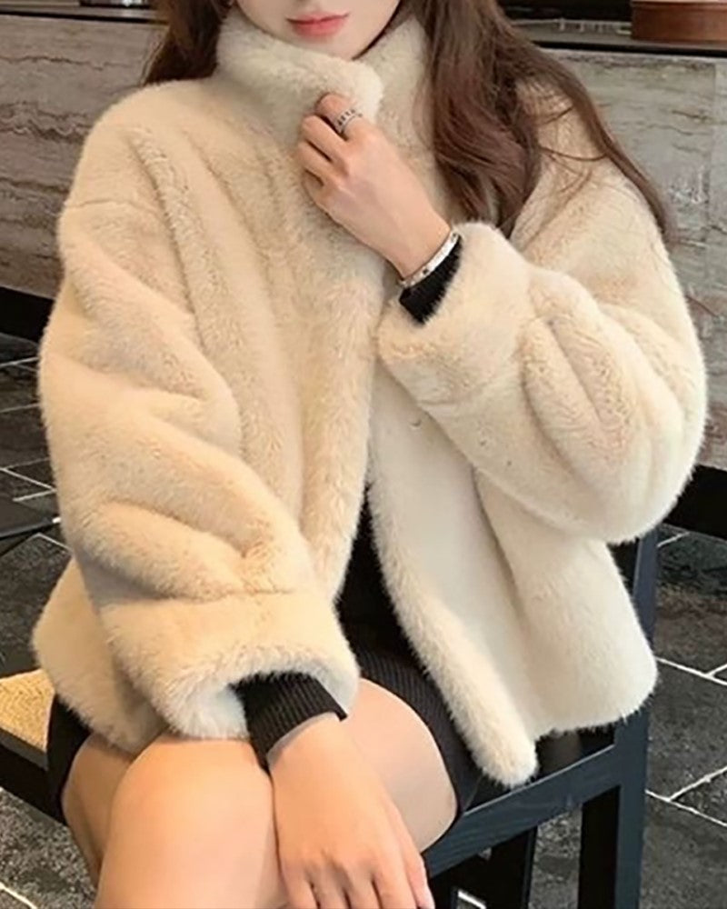 Womens High Neck Open Front Long Sleeve Faux Fur Crop Coat Soft Winter Warm Jacket Outerwear