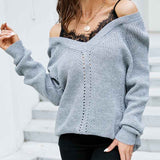 Women's Lace Pullover Sweaters Casual V Neck Cold Shoulder Tops Cute Long Sleeve Off Shoulder Sweater Tops k605