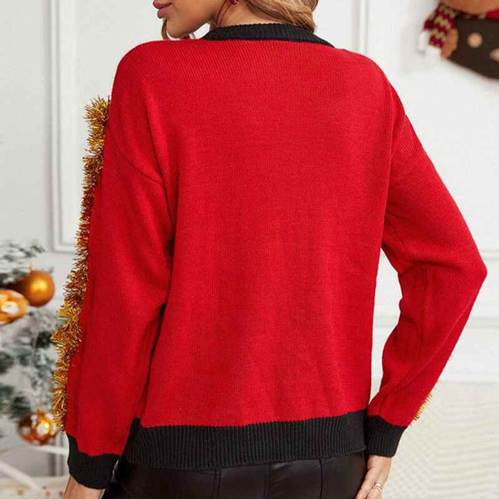 A loose and casual knitted ugly Christmas sweater paired with a long-sleeved pullover is warm, cute, and fun.