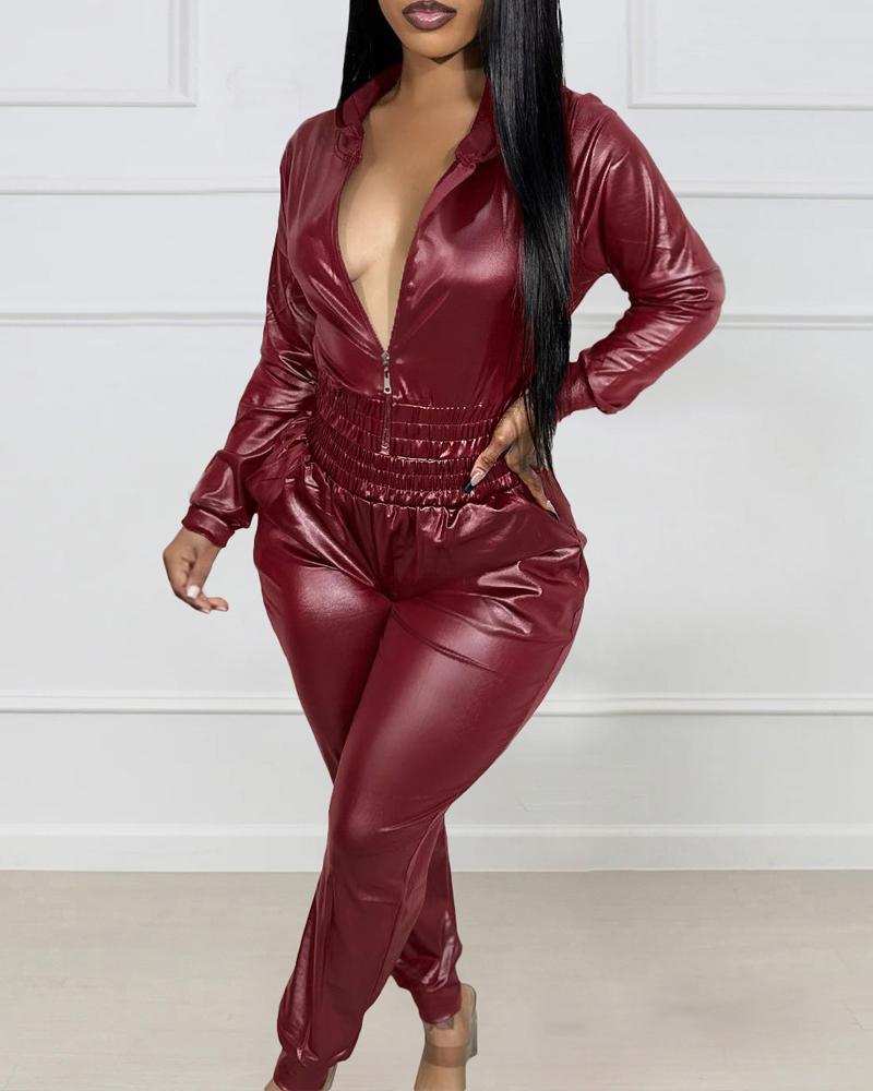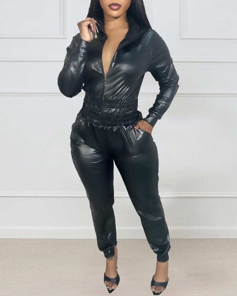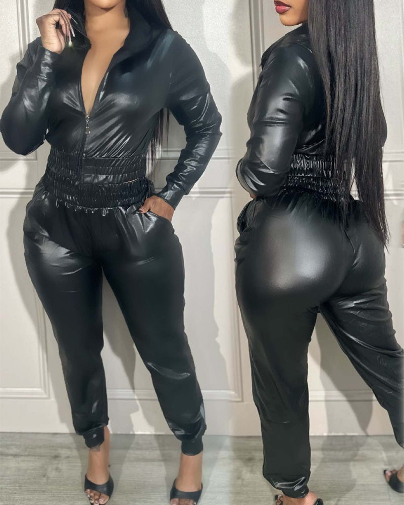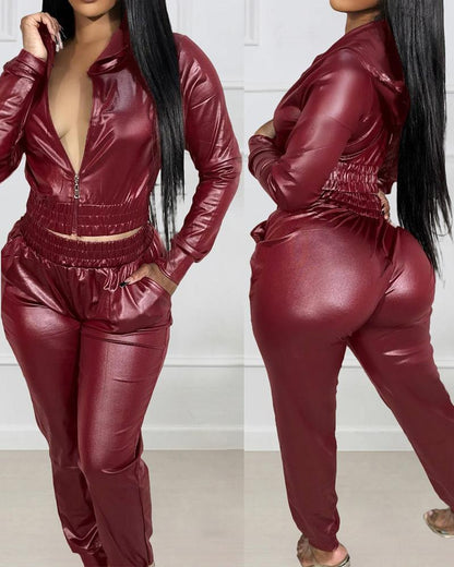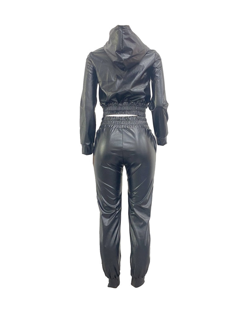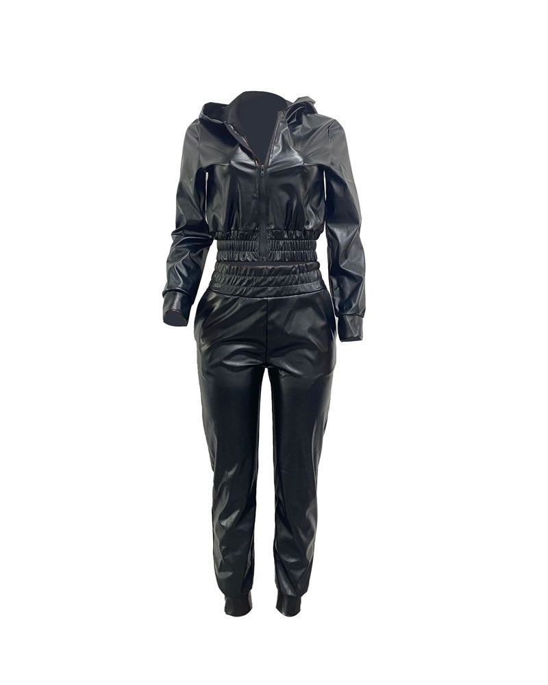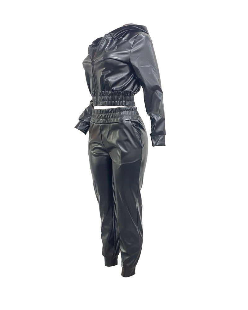 Zipper Design PU Leather Top & Pants Set